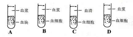 12 如下图所示,将新鲜血液分别放入A、B、C、D四支试管中,其中A、B试管加入抗凝剂,C、D不加任何物质,静置24小时后,正确的图示是( )