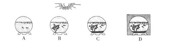 ④ 把A、C、B瓶置于阳光下,D瓶放在黑暗的环境中。实验装置如下图所示: