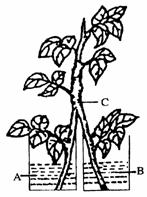 如图所示:剪取生命活动旺盛的一根新鲜月季枝条。取两只烧杯,A内盛有蓝色水溶液,B内盛有红色水溶液(有色物质对生命无害)。将月季枝条基部纵剖,分别插入两只烧杯的溶液中,在阳光下照射3-4小时。