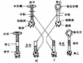伞藻的身体是由一个细胞构成的。(如右图)其细胞核只位于假根中。甲种伞藻的帽呈伞形,乙种伞藻的帽呈菊花形。科学家先将甲、乙伞藻的帽都切除,然后将乙伞藻的伞柄移植到甲伞藻的假根上(称为丙),将甲伞藻的伞柄移植到乙伞藻的假根上(称为丁)。一段时间后,丙、丁伞藻都长出了新的帽,帽的形状如上图所示。