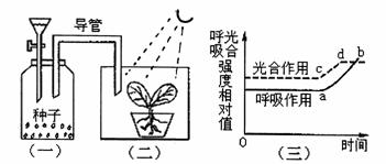 某同学为研究某些环境因素对光合作用和呼吸作用的影响,设计了右面的实验装置(一)、(二)。由漏斗向种子内加入少量水(对应图(三)中的a点)后,测定的种子呼吸作用和植物光合作用强度变化由线如右图(三)所示。请据图分析回答: