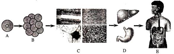 6.下图中,A---------E示意人体的不同结构层次,请据图分析回答下列问题。