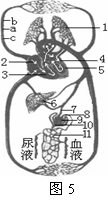 5. 图5是人体血液循环模式图,请据图回答:
