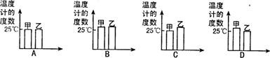 右图表示在25℃条件下研究种子萌发过程中温度变化的实验装置:取甲、乙两个暖水瓶,甲瓶内装有萌发的豌豆种子,乙瓶内装有煮熟并冷却至25℃的豌豆种子,两瓶均用包有温度计的棉团塞严。能正确表示几小时后温度计读数的是