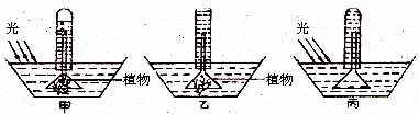 38.下图中甲是在有光照条件下验证O2是否由绿色植物释放出来的装置;乙和丙是另2个装置,通常可作为甲的对照实验的装置是