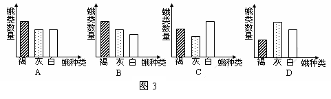 9.恩施州某地有一个大型的石灰厂,其白色的粉尘使周围的植物都变成了灰白色。如果该厂长期生产,请你推测,该厂周围环境中不同颜色的蛾类最可能的变化结果是图3中的