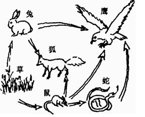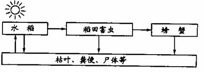 4.2007年10月,辽宁农民在水稻田中进行养蟹试验并初获成功。插秧时,他们调整了水稻种植的行间距,留出较宽的养蟹通道,使得稻田有较长的透光时间。放养蟹苗后,稻田中的稻谷虫等多种害虫,成为螃蟹丰富的食物,而螃蟹的粪便又成为水稻的肥料,实现了稻、蟹双丰收(如下图),农民既节省了农药、化肥又生产了有机食品。(8分)