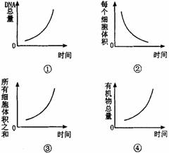 右图表示蛙的受精卵发育至囊胚过程中,DNA总量、每个细胞体积、所有细胞体积之和,有机物总量的变化趋势(横坐标为发育时间),其中正确的是