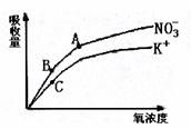 42.右图是胡萝卜在不同的含氧情况下从硝酸钾溶液中吸收K+和NO