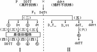 (6分)现有两纯种小麦,一纯种小麦性状是高秆(D),抗锈病(T);另一纯种小麦的性状是矮秆(d),易染锈病(t)(两对基因独立遗传)。育种专家提出了如图I、II两种育种方法以获得小麦新品种,问: