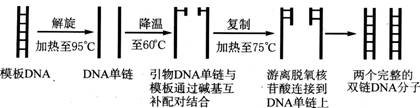 35.近年来PCR技术(DNA聚合酶链反应技术)成为分子生物实验的一种常规手段,其原理是利用DNA半保留复制的特性,在试管中进行DNA的人工复制(见下图),在很短的时间内,将DNA扩增几百万倍甚至几十亿倍,使分子生物实验所需的遗传物质不再受限于活的生物体。据此回答下列问题: