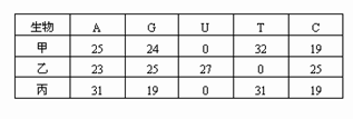 (2分)甲、乙、丙是从3种生物中提取的核酸,经分析它们的碱基比率如下表: