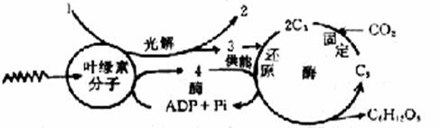 答案:(1)叶绿体基粒;叶绿体基质。(2)1;水;氢[H];氧气 (3)CO2的固定;还原。(4)CO2(5)3、[H]、4、ATP;催化 (6)三碳化合物。