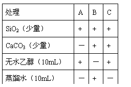 分别在A、B、C三个研钵中加2g剪碎的新鲜菠菜绿叶,并按下表所示添加试剂,经研磨、过滤得到三种不同颜色的溶液,即:深绿色、黄绿色(或褐色)、几乎无色。