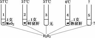37.(5分)下图是验证酶的催化特性的几组对比实验,1―5号试管内装有等量的H2O2液。1―4号试管控制温度与投入物品如图所示,请回答: