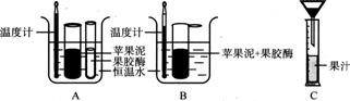 ①将果胶酶与苹果泥分装于不同试管,在100C水浴中恒温处理10 min(如图A)。