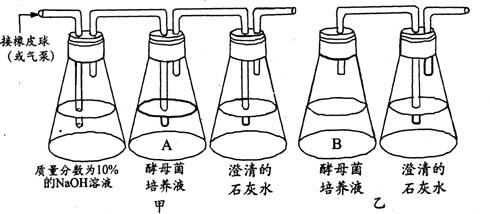 ③检测C02的产生:甲装置连通橡皮球(或气泵),让空气持续地依次通过3个锥形瓶。然后将实验装置放到25-30℃的环境中培养一段时间。乙装置在相同的条件下培养相同的时间。观察两装置的浑浊程度,并将观察到的现象填在记录表中。