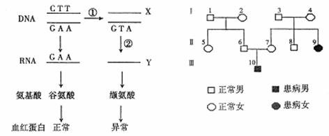 32.(10分)左下图表示人类镰刀型细胞贫血症的病因,右下图是一个家族中该病的遗传系谱图(控制基因为B和b),请据图回答(谷氨酸的密码子是GAA,GAG):