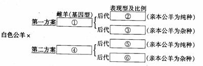 (2)若判断一只白色公羊是纯合子还是杂合子,方法可有以上两种,请完成鉴定方案(按要求填写①~⑥的基因型、表现型及比例)。