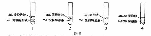 25.在编号为1 、2 、3 、4 的四支试管中分别按图5 加人相应的溶液后,置于适宜的温度条件下保温一段时间。然后分别依次加入斐林试剂、斐林试剂、双缩脉试剂、双缩脉试剂各2mL ,摇匀后将1 号和2 号试管置于水浴锅内加热煮沸,3 号和4 号试管置于冷水中,则各试管的颜色变化是