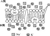 (4)若该结构是人体红细胞的相应结构,则A侧液体是 ,B侧液体是 。如此判断的理由是 ;在A、B两侧中,葡萄糖分子 侧浓度高,葡萄糖分子通过此结构需要的条件是 。Na+、K+的运输方式是 ,除图示条件外,它们的运输还需要的条件有 ;(a)、(b)之所以能转运K+、Na+,与其 有关。