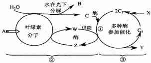 44.(8分)下图为光合作用过程示意图,A、B、C、W、X、Y、Z代表各种物质或能量,①、②、③代表过程,请据图回答下列问题: