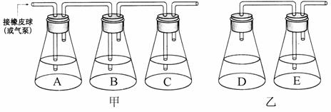 (1)实验时,在A、B、C、D、E五个锥形瓶中,应将酵母菌及含葡萄糖的培养液加入 瓶中,澄清的石灰水应加入 瓶中;而应在 瓶中加入NaOH溶液,其目的是 。