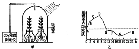 1、(2010·江苏·测试)将两株植物放在封闭的玻璃罩内,用全素营养液置于室外进行培养(如甲图所示),假定玻璃罩内植物的生理状态和自然环境中相同,且空气湿度对植物蒸腾作用的影响、微生物对CO2浓度影响均忽略不计。现用CO2浓度测定仪测定了该玻璃罩内CO2浓度的变化情况,绘制成如乙图所示曲线。请据图分析回答: