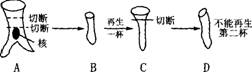 12.汉麦林(Hammerlin的实验如图所示,在单细胞的地中海杯状藻先在近核处切断,再在近杯处切断A,此中间之茎B置海水中可再生成一杯C,但将此杯切掉后,不能再生成第二个杯D。