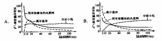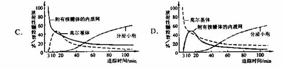 38、下图表示用3H-亮氨酸标记细胞内的分泌蛋白,追踪不同时间具有放射性的分泌蛋白颗粒在细胞内分布情况和运输过程。其中正确的是