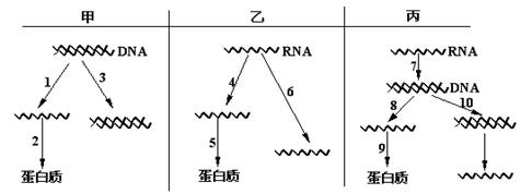 53.(10分)已知甲、乙、丙三种类型的病毒,它们的遗传信息的传递方式分别用下图表示,据图回答下列问题: