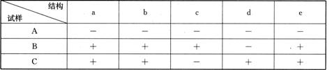 62.(7分)分析下面的实验,回答问题: 调节电子显微镜观察A、B、C三种生物的细胞亚显微结构,观察到结构a-d具有下列特征:结构a、b、c都是由两层膜构成,其中a的膜具有小孔,而b、c没有小孔,c呈绿色、扁平的椭球形或球形,d结构与细胞有丝分裂有关。现将试样A、B、C有无结构a-d的情况整理列表如下(表中“+”表示存在,“一”表示不存在):