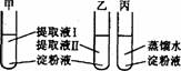 21、将小麦种子分别置于20℃和30℃培养箱中培养4天,依次取等量的萌发种子分别制成提取液Ⅰ和提取液Ⅱ。取3支试管甲、乙、丙,分别加入等量的淀粉液,然后按下图加入等量的提取液和蒸馏水,45℃水浴保温5分钟,立即在3支试管中加入等量斐林试剂并煮沸2分钟,摇匀观察试管中的颜色。结果是( )