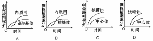 40、从某腺体的细胞中提取一些细胞器,放入含有14C的氨基酸的培养液中,培养液中含有这些细胞器完成其功能所需的物质和条件,连续取样测定标记的氨基酸在这些细胞器中的数量,图中能正确描述14C氨基酸数量的曲线是( )