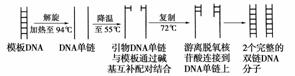 36.(8分)资料显示,近10年来,PCR技术(聚合酶链反应技术)成为分子生物学实验的一种常规手段。它利用DNA半保留复制的特性,在试管中进行DNA的人工复制(如图所示),在很短时间内,将DNA扩增几百万倍甚至几十亿倍,使分子生物实验所需的遗传物质不再受限于自生物体获得。请据图回答: