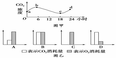 27、若图甲表示某地夏季一密闭大棚内一昼夜间CO2浓度的变化,而图乙表示棚内植株在b点时,消耗的CO2总量与消耗的O2总量之比(体积比),其中正确的是( )