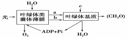 28、 如图为光合作用过程示意图,在适宜条件下栽培的小麦,如果突然将c降低至极低水平(其他条件不变),则a、b在叶绿体中的含量变化将会是( )