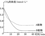将叶面积相等的A、B两种植物的叶片分别放置在相同的、温度适宜且恒定的密闭小室中,给予充足的光照,利用红外测量仪每隔5 min测定一次小室中的CO2浓度,结果如图所示。对此实验叙述正确的是( )