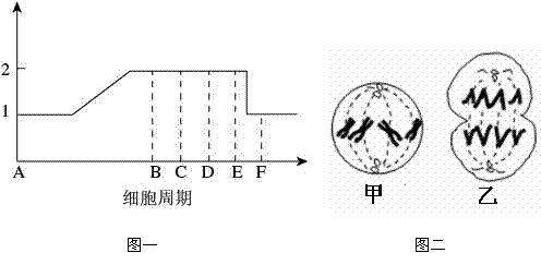 (6分)对某生物体细胞的细胞核中的DNA含量进行测定,在细胞周期中每个细胞核中DNA含量的变化曲线如图一所示,纵坐标为每个核中DNA的相对含量,横坐标为细胞周期。图二是两个正在分裂的细胞模式图。请回答下列问题。