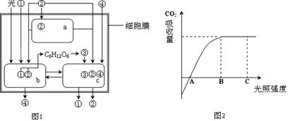 43.图1表示细胞代谢的某些过程,图2表示光照强度与二氧化碳吸收量的关系。请据图回答问题:(图中数字代表物质,a、b、c代表细胞器)(13分)
