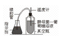 一位学生将葡萄糖和酵母菌溶液放入一个真空瓶中,并用带有两个孔的塞子封口,酵母-葡萄糖溶液的温度随时间慢慢地升高,指示剂的颜色也开始改变。本实验可用来测定