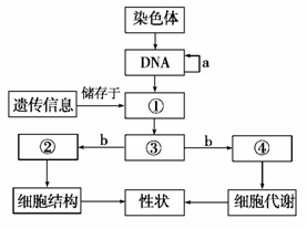 解析:题干为概念图,①应为具有遗传效应的基因,它可转录为③mRNA,进而指导蛋白质②、④(酶)合成,达到控制性状的目的。a为DNA自我复制,b为转录。