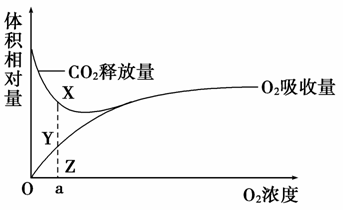 9.下图表示某植物幼根的细胞呼吸过程中,O2的吸收量和CO2的释放量随环境中O2浓度的变化而变化的曲线,其中线段XY=YZ,则在氧浓度为a时说明正确的是( )