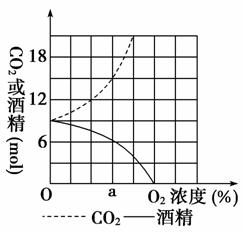 11.现有一瓶酵母菌和葡萄糖的混合液,通入不同浓度的氧气,产生的酒精和二氧化碳如图所示。则在氧气浓度为a时( )