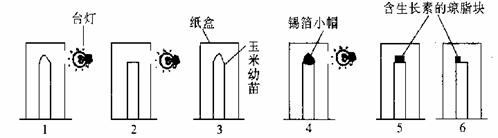 方法步骤:选取6株品种、粗细和大小均相同的玉米幼苗(要求幼苗的真叶未突破胚芽鞘),按下图所示方法进行实验处理。观察并记录玉米幼苗的生长情况。