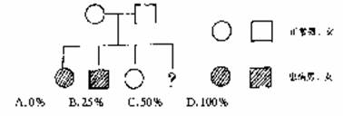 27.如图的这一条谱图中有一成员得了一种常染色体的隐性疾病,第4个孩子得这种病的几率是多少?( )