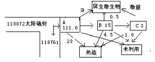 21.下图是某湖泊生态系统能量流动的定量分析图解:图中的A、B、C代表三个营养级,数字单位是百万千焦。已知该系统受到的太阳辐射能为118 872百万千焦,其中118 761百万千焦的能量未被利用。请回答: