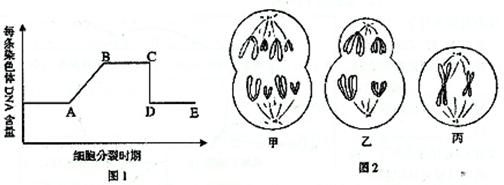 35.(10分)下列是有关细胞分裂的问题。图1表示细胞分裂的不同时期与每条染色体DNA含量变化的关系;图2表示处于细胞分裂不同时期的细胞图象,请据图回答: