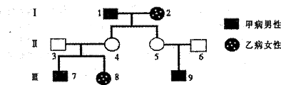 (3)数年后的某一家族,发现有的成员患甲种遗传病(设显性基因为A,隐性基因为a),有的成员患乙种遗传病(设显性基因为B,隐性基因为b)。上图为其遗传系谱图。现已查明,Ⅱ6不携带致病基因,则甲种遗传病的致病基因位于 染色体上,乙种遗传病的致病基因位于 染色体上。若Ⅲ8和Ⅲ9婚配,他们生一个同时患甲、乙两种遗传病的女儿的概率是 。