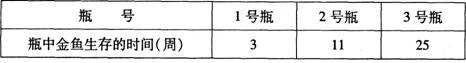 取同样形状同样体积的锥形瓶三个分别标记为1、2、3号,1、2、3号分别加等量的水,3号加少许河泥,再在1、2、3中加入同样的金鱼,2、3中加人等量的金鱼藻,用橡胶塞塞紧。然后放在散射光下。记录结果如下表所示: